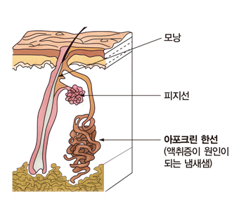 아포크린 땀샘은 지방성분의 땀을 내보내는데, 이들은 사춘기가 되어 호르몬의 작용이 왕성해지면 활성화되어 분비되게 됩니다. 이때 그 부위에 있던 세균이 땀속의 지방성분을 분해하여 지방산을 만들어내면서 특이한 냄새가 나게 되며 냄새가 과도할 경우 수술적 치료를 하기도 합니다.