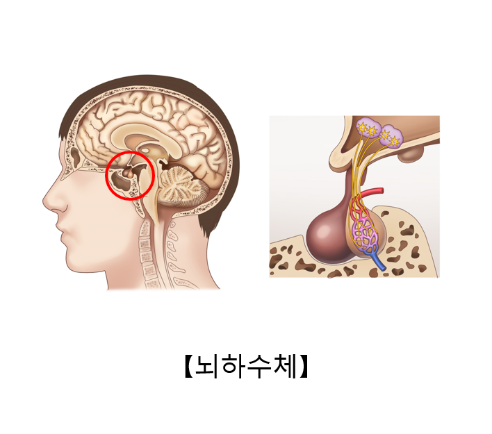 뇌하수체는 상부에 있는 시상하부와 연결되어 우리 몸의 호르몬 분비 및 조절에 관여하는 기관입니다. 말안장과 같이 생긴 터어키안에 위치합니다. 해부학적으로는 선뇌하수체와 신경뇌하수체로 나누어집니다. 또한 뇌하수체 주위에는 시신경, 시교차, 내경동맥, 해면정맥동, 측두엽이 위치하여, 종양이 발생하면 이와 관련된 여러 가지 증상이 나타날 수 있습니다.