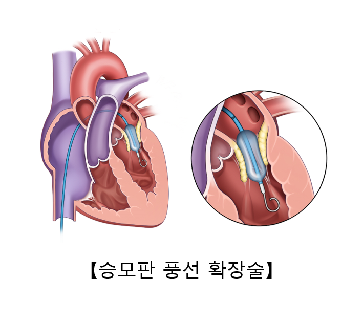 심장판막 중 승모판에 류마티스성 협착이 있는 경우에, 대퇴 혈관을 통해 카테터를 삽입한 후 풍선을 이용하여 승모판의 협착을 치료하는 방법입니다. 대퇴정맥을 통해 도관을 우심방까지 진입시키고, 심방 사이의 심방 중격에 작은 구멍을 뚫어 좌심방으로 진입시킨 후 좁아진 판막에 풍선을 정확히 위치시켜 충분히 넓어질 때까지 부풀려서 치료합니다. 한 번의 시술로 증상이 확연히 개선되며, 하루가 지나면 일상생활을 영위할 수 있습니다. 시술 이후에 재발할 가능성이 있으므로 정기적으로 심초음파 검사를 시행하여 추적 관찰해야 합니다.