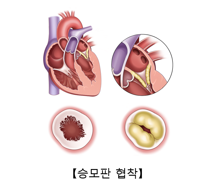승모판막은 좌심방과 좌심실 사이에 있는 판막입니다. 승모판막 협착증의 대부분 원인은 류마티스성(rheumatic)입니다. 이는 류마티스열(rheumatic fever)이라는 질환에 의하여 심장판막에 염증이 발생한 것을 말합니다. 이 염증이 아물면서 판막이 서로 들러붙고 석회화됩니다. 이로 인해 판막이 심실의 이완기에 잘 열리지 않으면서 좌심방의 압력이 상승하는 질환입니다.
