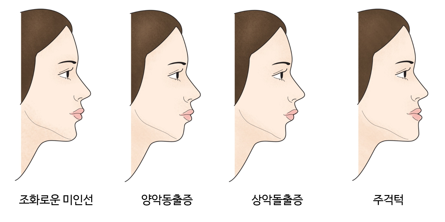 상악의 제1대구치가 하악 제1대구치와 교합면이 맞지 않고, 후방으로 위치하는 경우 3급 부정교합으로 진단하게 됩니다. 이때, 정상적인 치아의 맞물림 상태에서는 윗니가 아랫니를 살짝 덮어야 하는데 주걱턱에서는 대개 치아의 관계가 반대로 되어 아랫니가 윗니보다 앞으로 나와 있습니다. 이를 자연스럽게 물고 앞니의 치아 맞물림 상태를 살펴보세요. 주걱턱 수술을 통하여 얼굴의 균형을 바로 잡아 조화로운 얼굴 모양을 만들어 줄 수 있습니다.