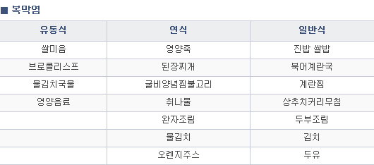 부드럽게 조리한 육류 및 생선류,  섬유질이 적은 채소, 연한 과일 및 주스